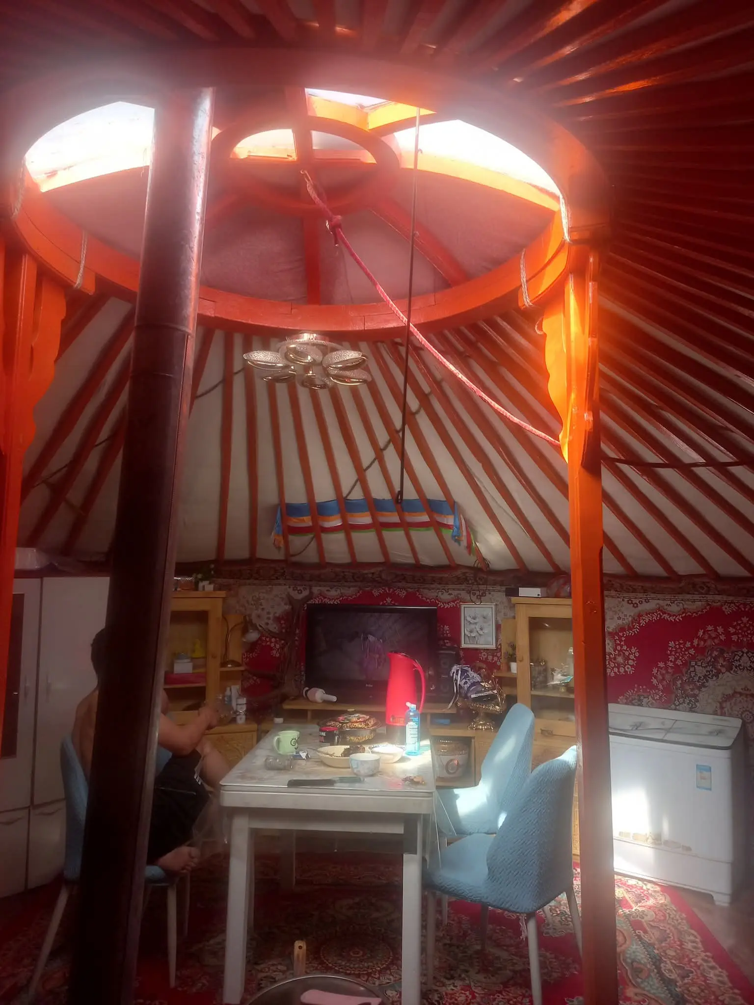 - Sleep in your own ger (yurt) — a circular felt tent that stays surprisingly warm. Every morning you open the roof vent from the outside to let in light and fresh air.